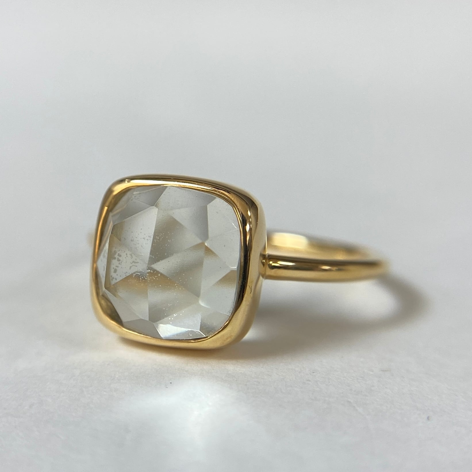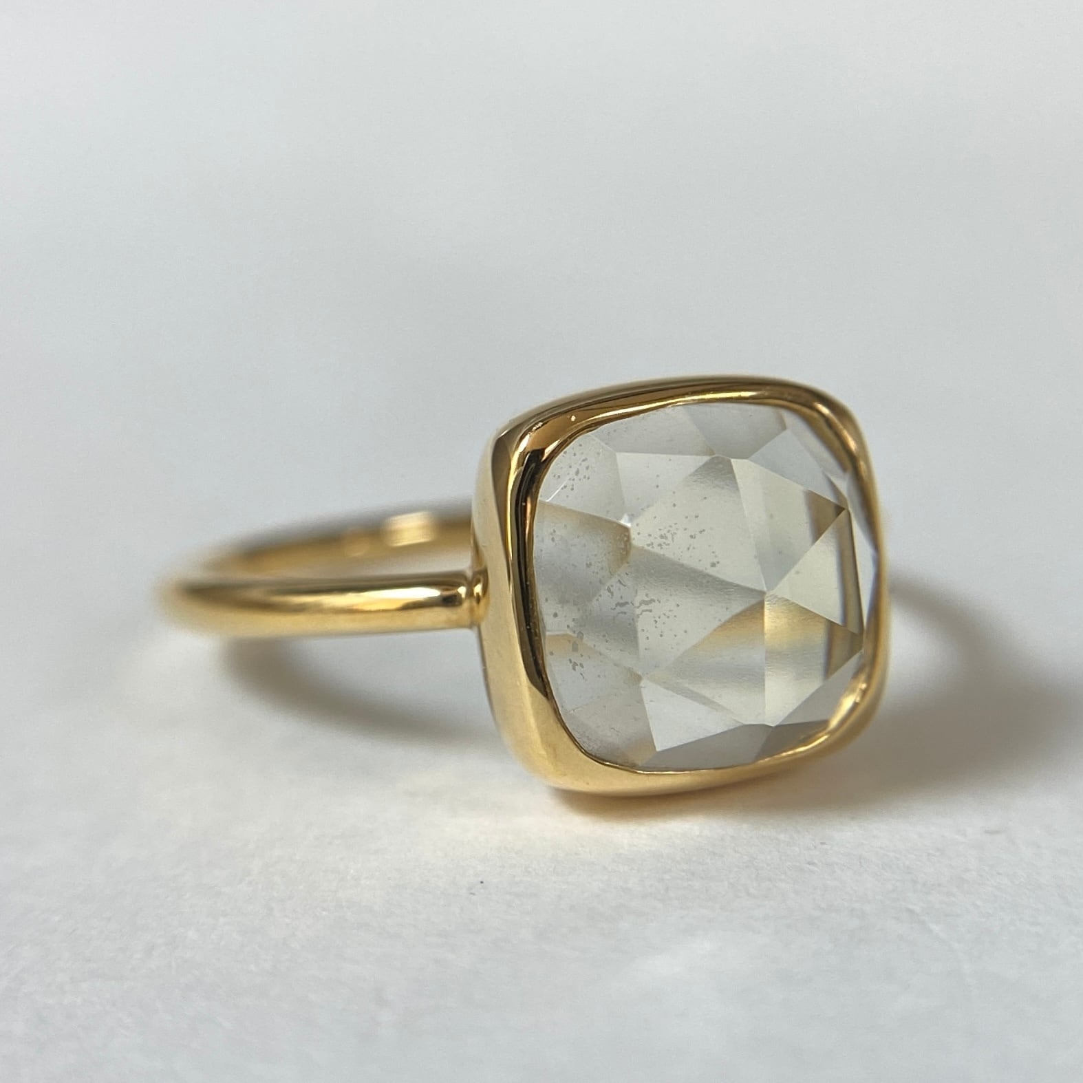 天然由来のインクルージョンが肉眼でお楽しみいただけます。 ほんのり感じる柔らかい緑色が普段使いしやすく、程よい存在感を放ちます。 Stone:グリーンアメジスト&クォーツ Material:K18 Size:11号 Weight:約2.6g Width:最大約9.3mm 最小約1.2mm