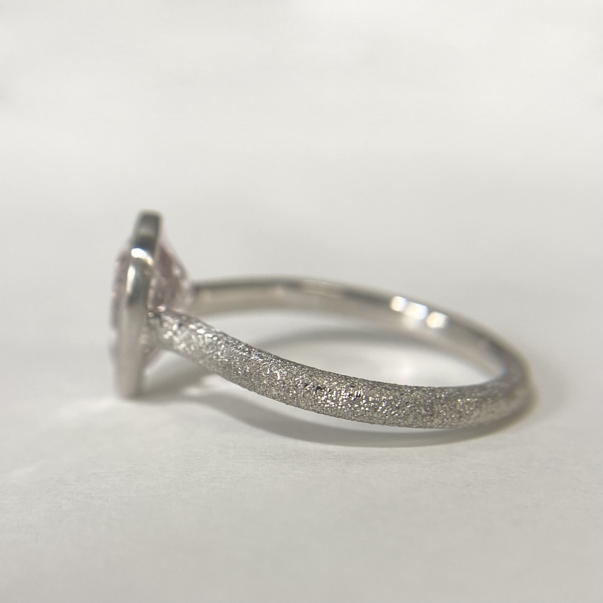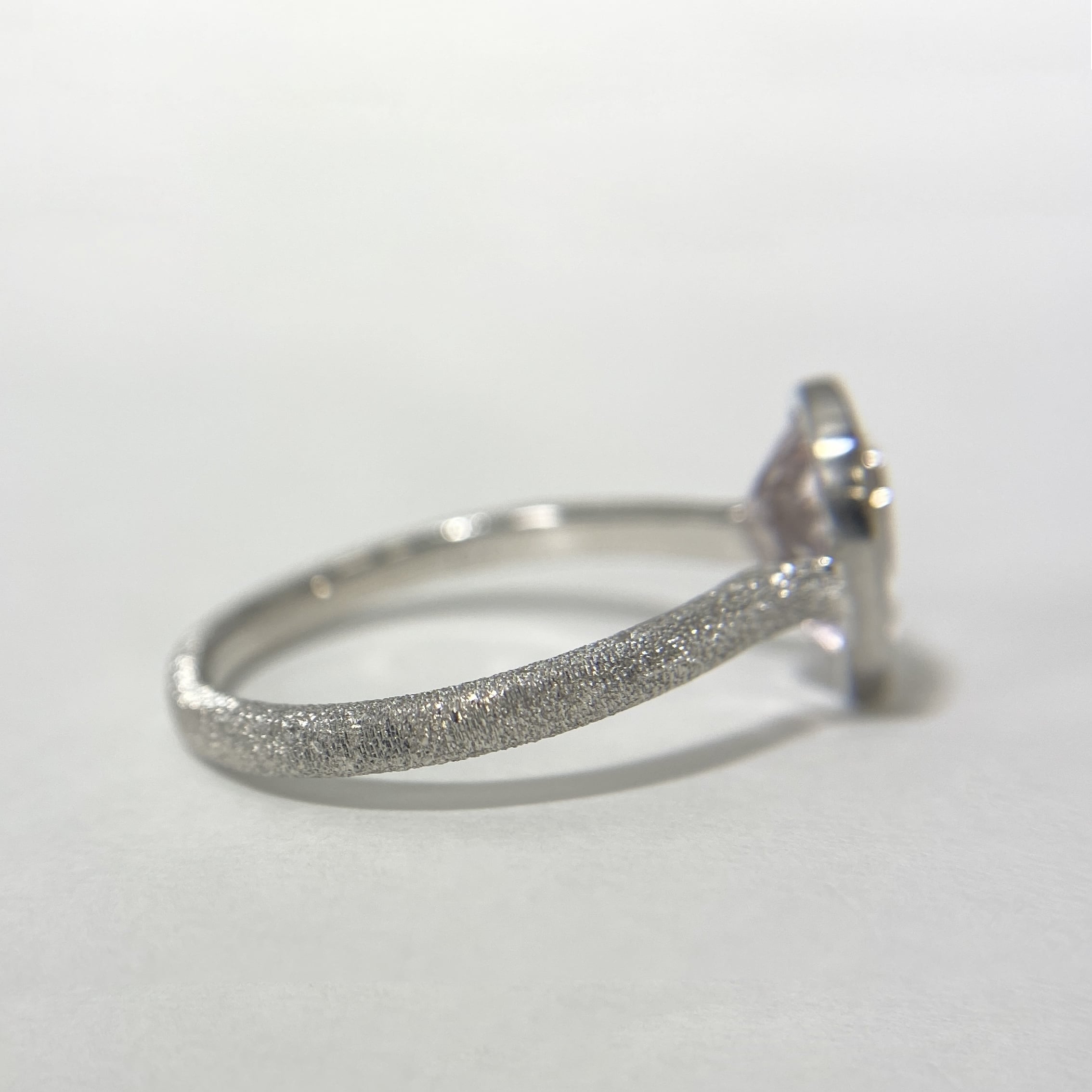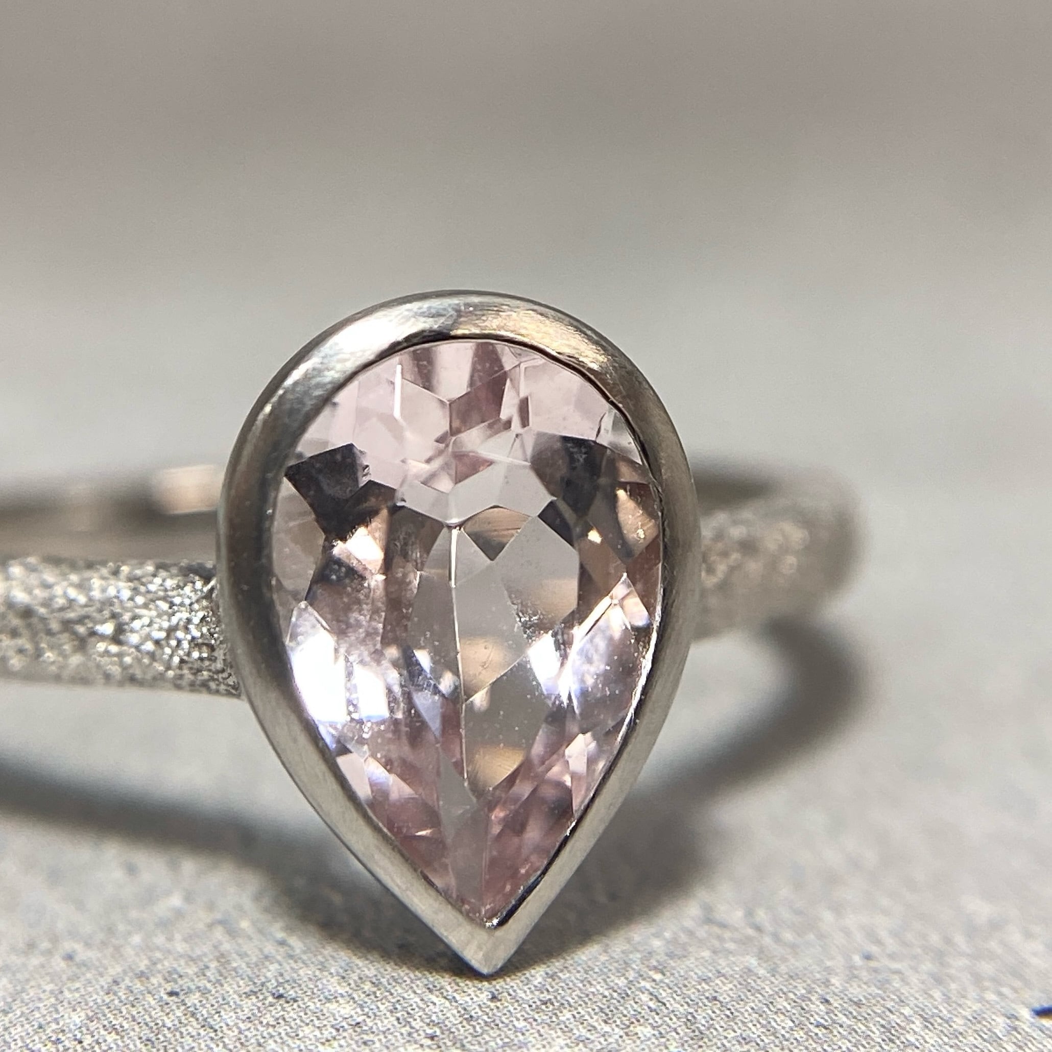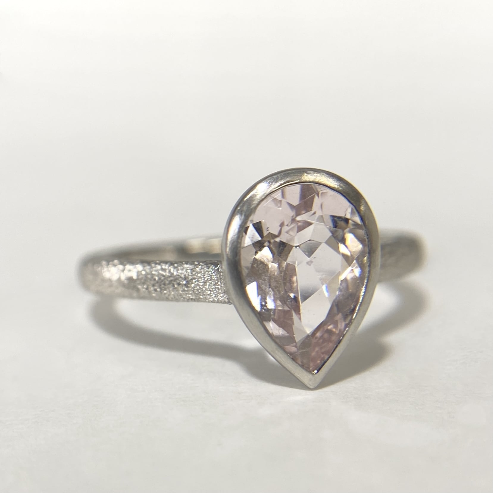 4月の誕生石「モルガナイト」 プラチナのクールな印象が モルガナイトの甘さをほどよく引き締め 可愛さと大人っぽさ、 どちらも感じられる仕上がりになっています◎ Stone:モルガナイト 1.06ct Material:Pt950 Size:12号 Weight:約3.5g Width:最大約10.6mm 最小約1.9mm BDRID