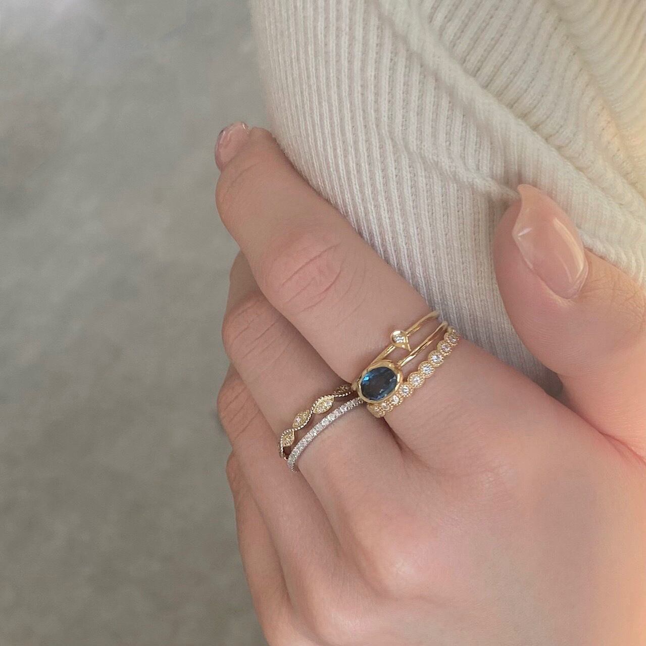 華奢な腕にワンポイントであしらわれた小ぶりなダイヤ。 シンプルだからこそ、一本で付けても重ね付けしてもコーディネートを楽しんでいただけます。 Stone:ダイヤモンド 0.01ct Material:K18 Size:11号 Weight:約0.9g Width:最大約4.0mm 最小約0.9mm BDRID031