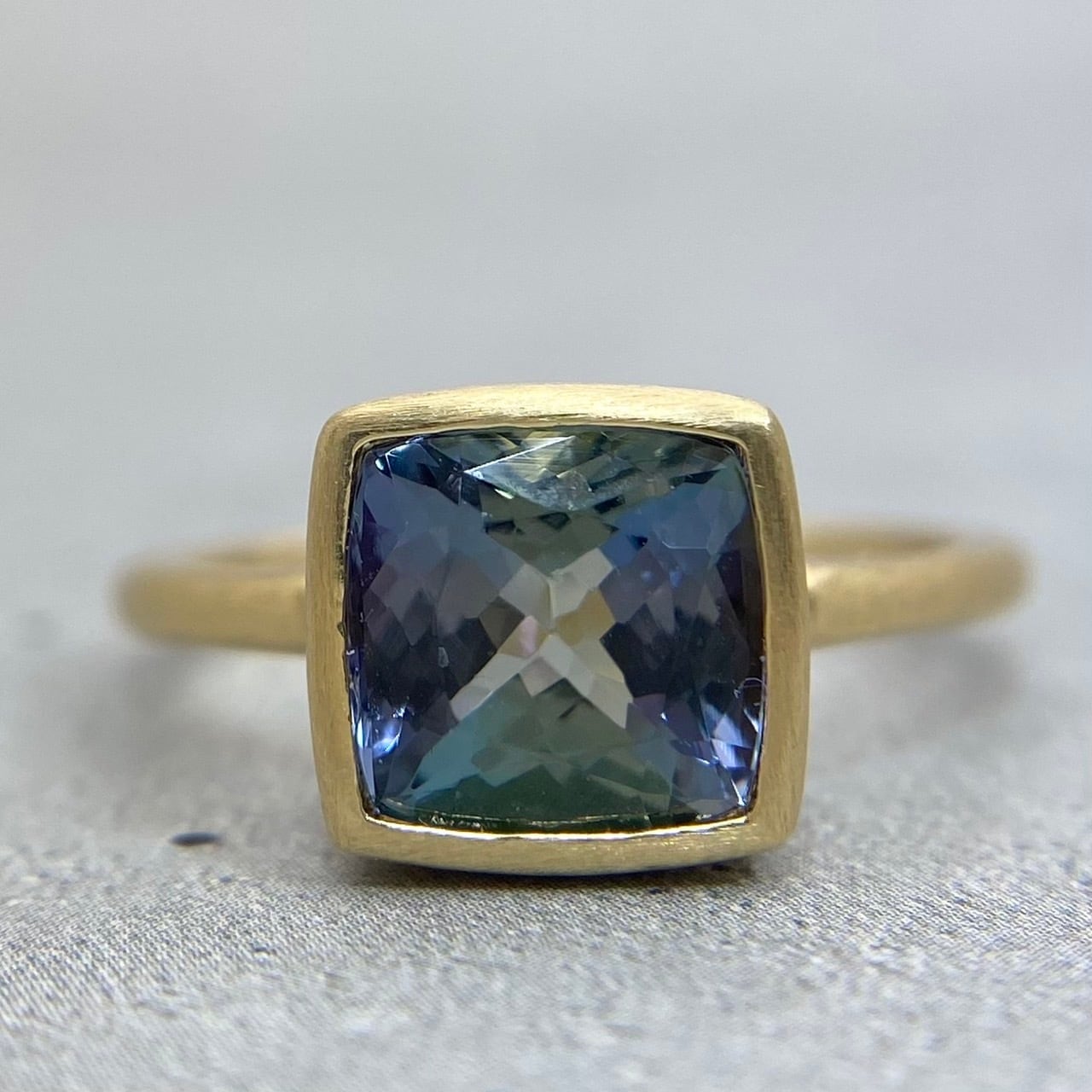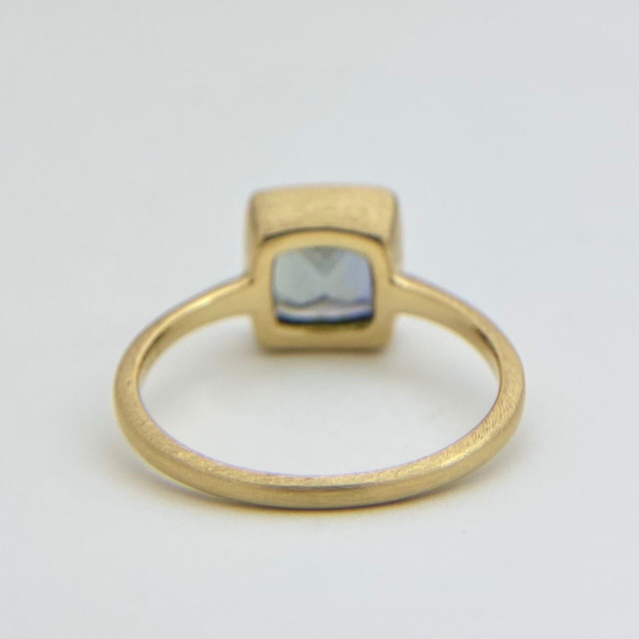 青と緑のグラデーションを地金で包み込み、リングに仕上げることでバイカラーゾイサイトの色味を指先で感じることができます。