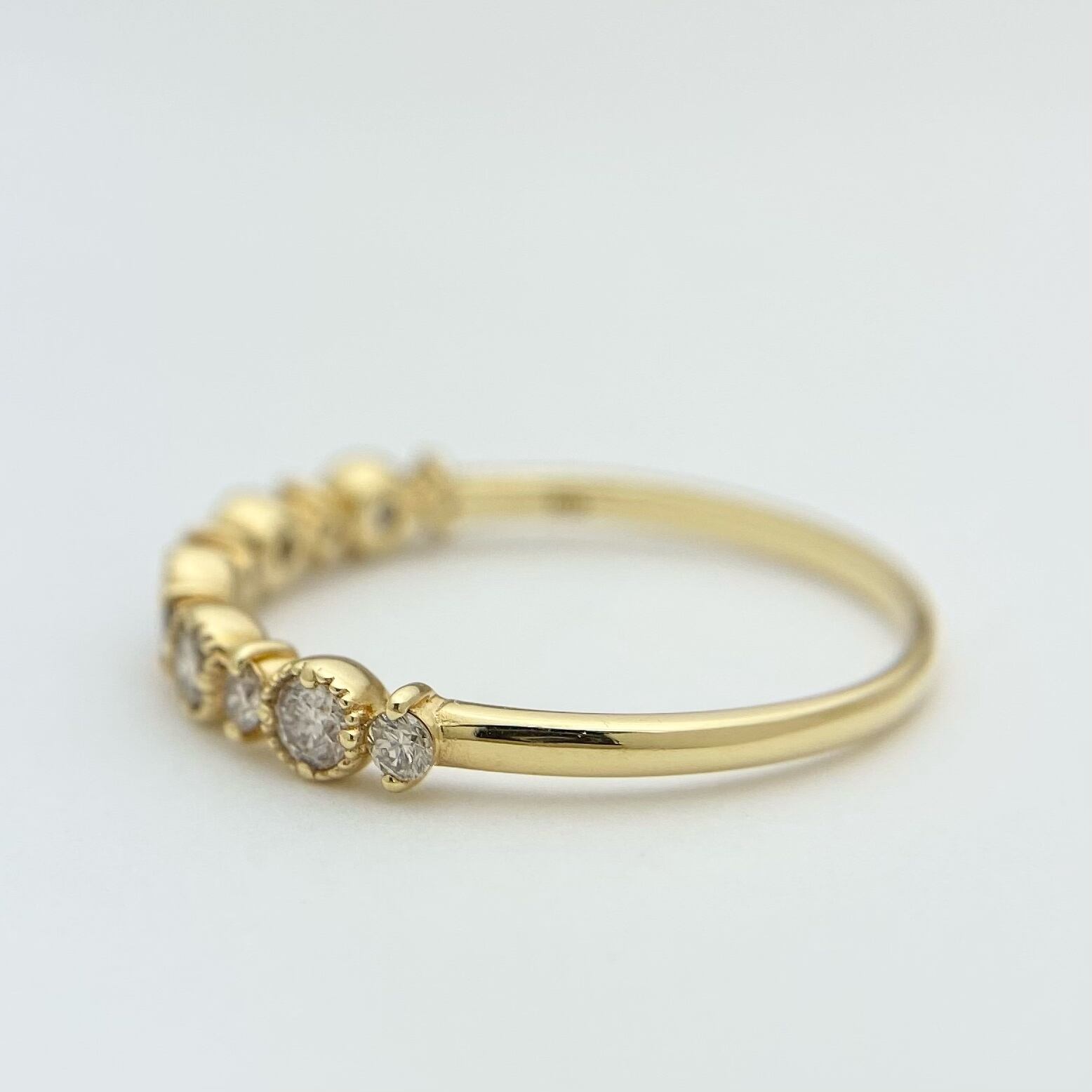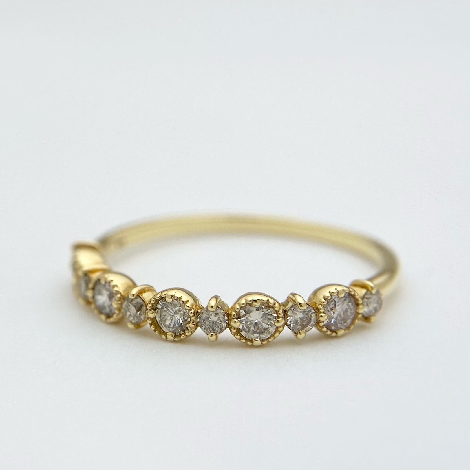 シンプルですがデザイン性のあるダイヤモンドリング。 カジュアルからフォーマルまで幅広いスタイルで身に着けていただけます。一本ではもちろん、お持ちのジュエリーと組み合わせてその日のコーディネートを楽しんでいただけます。 Stone:ダイヤモンド 0.30ct Material:K18 Size:12号 Weight:約1.3g Width:最大約2.8mm 最小約1.1mm BDRID055