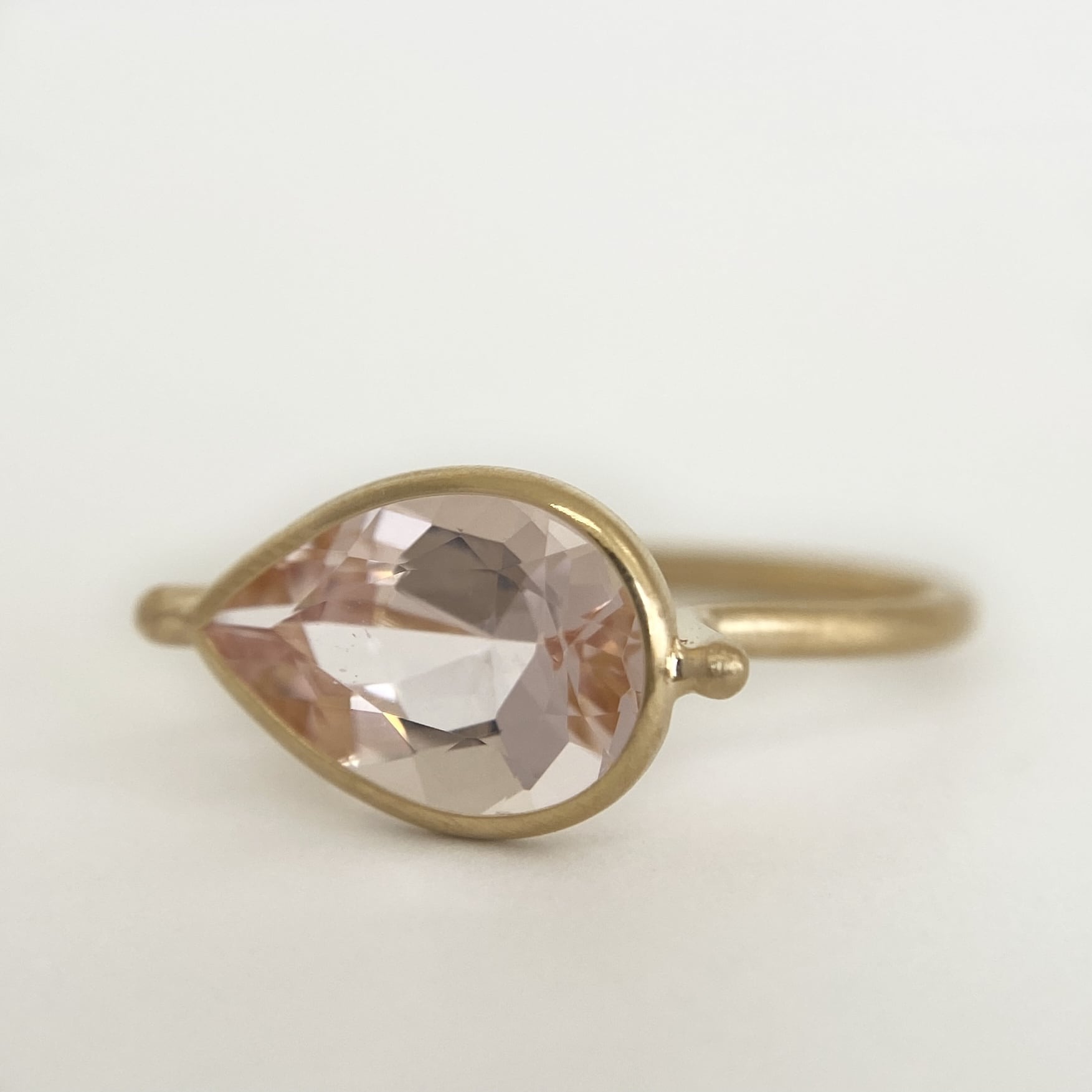 涙のような形が特徴のペアシェイプカットを地金で囲んだシンプルなデザインは、モルガナイトの輝きを際立たせ、マット加工を施すことでアンティーク調なテイストに仕上がりました。